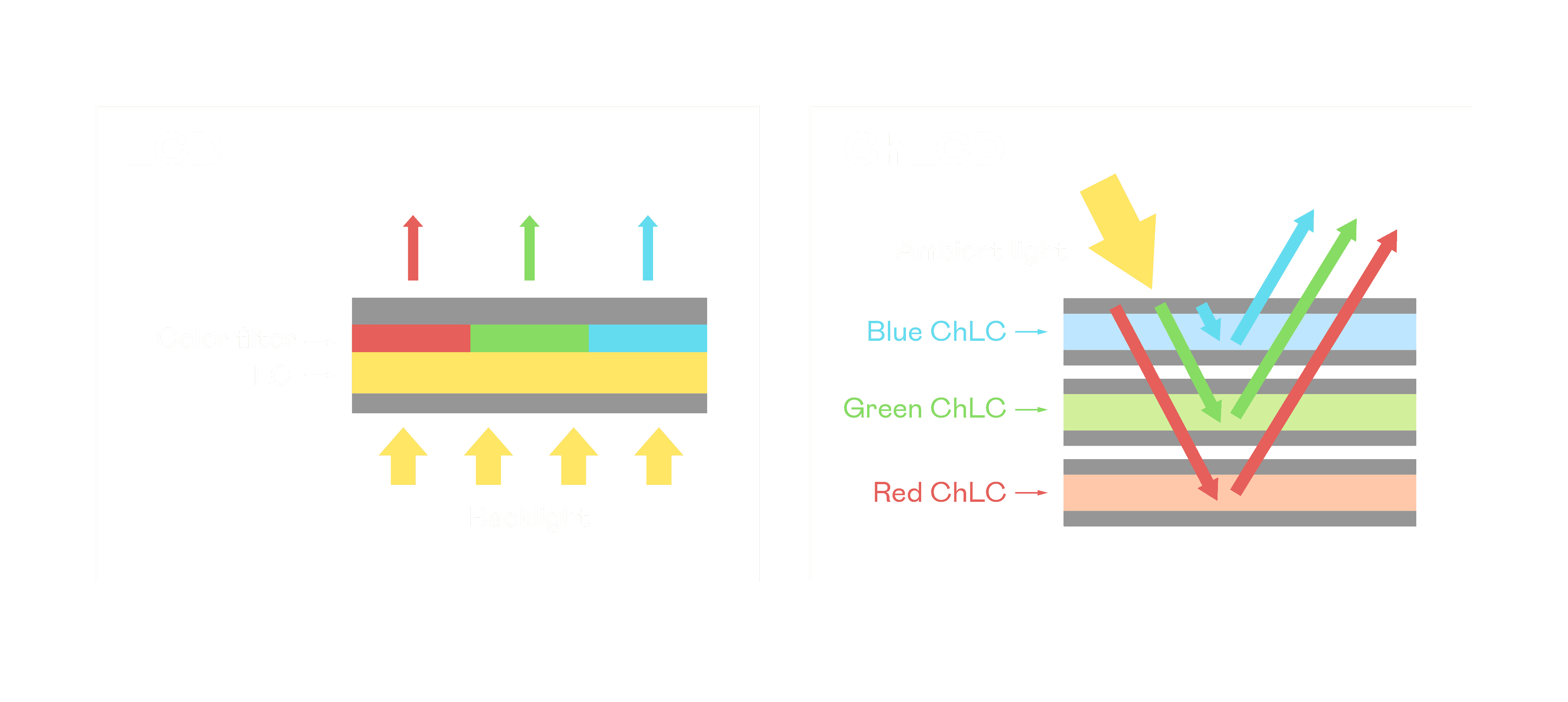 ChLCD 胆固醇液晶就如同纸张一样,,透过反射环境光来显示影像,,因此长时间观看不易造成人眼视觉疲劳,,,,可达到护眼效果。。当处于户外阳光下使用,,,,LCD 影像容易失真而不易观看,,,,但胆固醇液晶仍可维持较佳的影像品质。。。